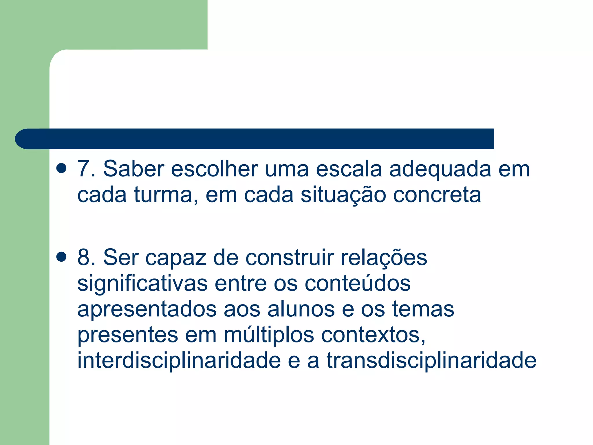 Odocumento discute as qualificações necessárias de umprofessoruniversitáriono século XXI, incluindo a capacidade de ensinar estudantes a aprender de forma independente, manter conhecimentos atualizados por meio de pesquisa e desenvolvimento profissional, e integrar ensino com práticas e discussões éticas.